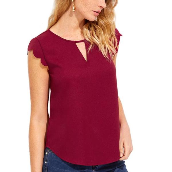 V Notch Front Scallop Trim Curved Hem Top Burgundy Round Neck Cap Sleeve Blouse Summer Casual Women Cut Out Tops