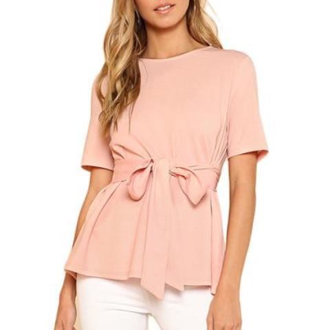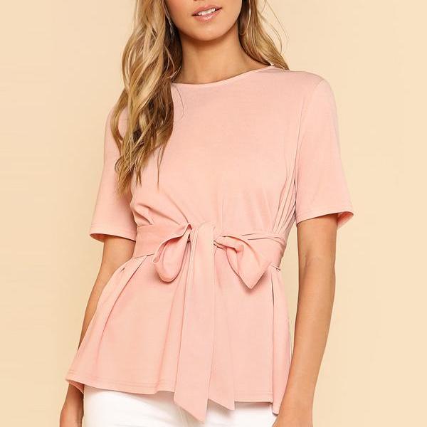 Pink Self Belt Keyhole Back Blouse Solid Short Sleeve Top 2018 Summer Women Office Ladies Work Elegant Blouse