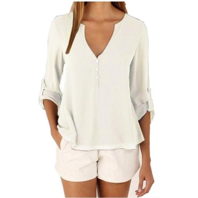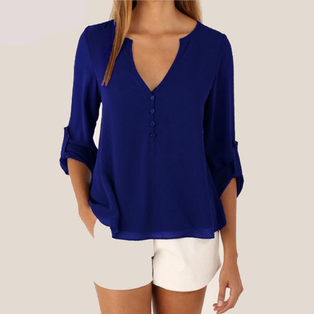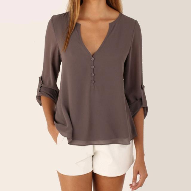 Plus Size S - 5XL Women Loose Shirt Three Quarter Sleeve deep V Neck Chiffon Blouse Shirt Women Tops Solid Shirt Blusas
