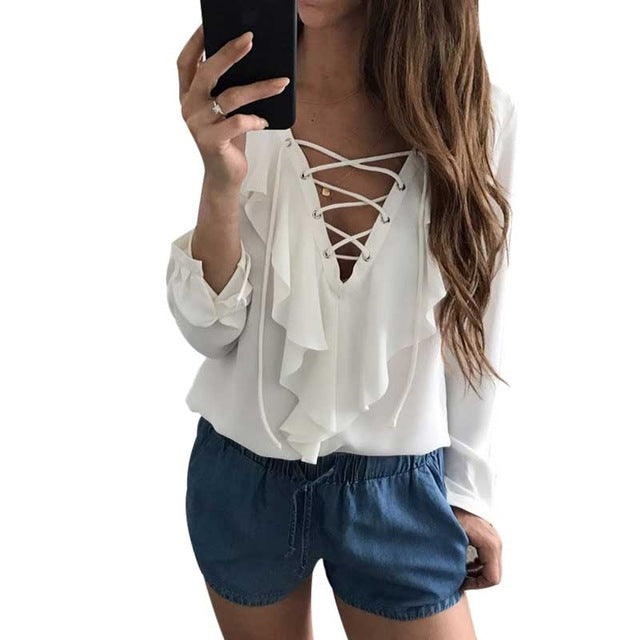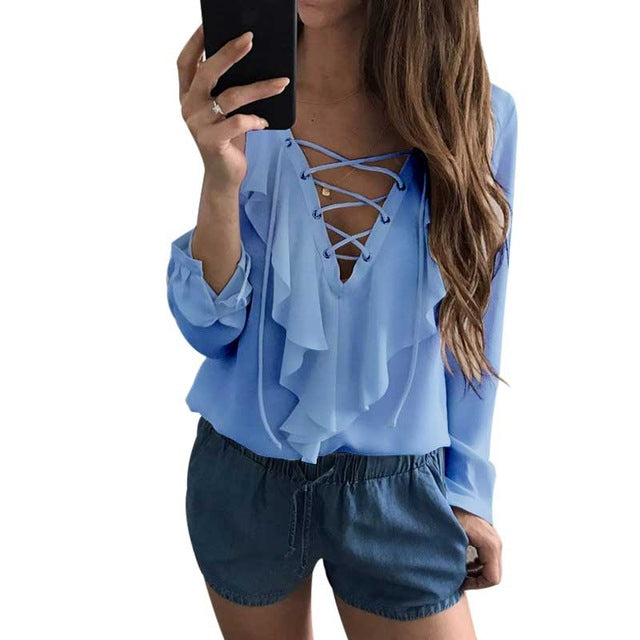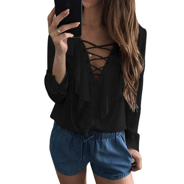 Gender: WomenPattern Type: SolidCollar: V-NeckSleeve Length(cm): FullMaterial: PolyesterDecoration: NoneModel Number: women blouseFabric Type: BroadclothSleeve Style: RegularStyle: CasualClothing Length: RegularType: Chiffon BlouseBlouse: V neck BlouseColor: White, Black, Wine Red, BlueSize: S,M,L,XLWholesale/Dropshipping: SupportStyle: Blusas MujerWomens Tops: Lace Up BlouseRuffle Blouse: Women Long Sleeve BlouseLadies Tops: White BlouseWhite Shirt: Office Blouse
